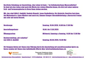 Kunstausstellung «Das Leben ist bunt…» + Zu Google Kalender hinzufügen + iCal / Outlook exportieren Datum 19. April 2026 - 17. Mai 2026 Uhrzeit 08:00 - 18:00